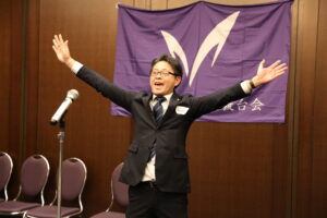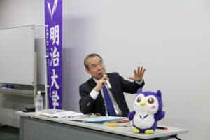 講演会では、元日本テレビアナウンサーの松永二三男氏を講師として招き、明治大学愛を大いに語って頂きました。